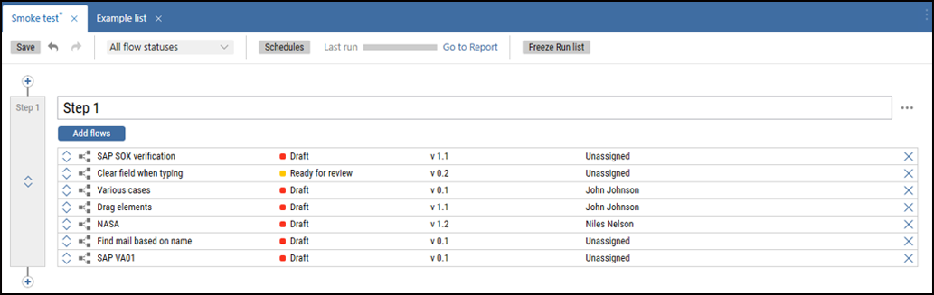 “Freeze Run Lists” provides absolute version control by enabling users to lock or “freeze” run lists and their associated automation flows. A locked version can be viewed at any time, and used by QA teams to assert that a flow approved in a given context remains unchanged. This way you can rest assured that flows approved are locked in a tamper-proof condition, and that overall test case validation is robust and secure.