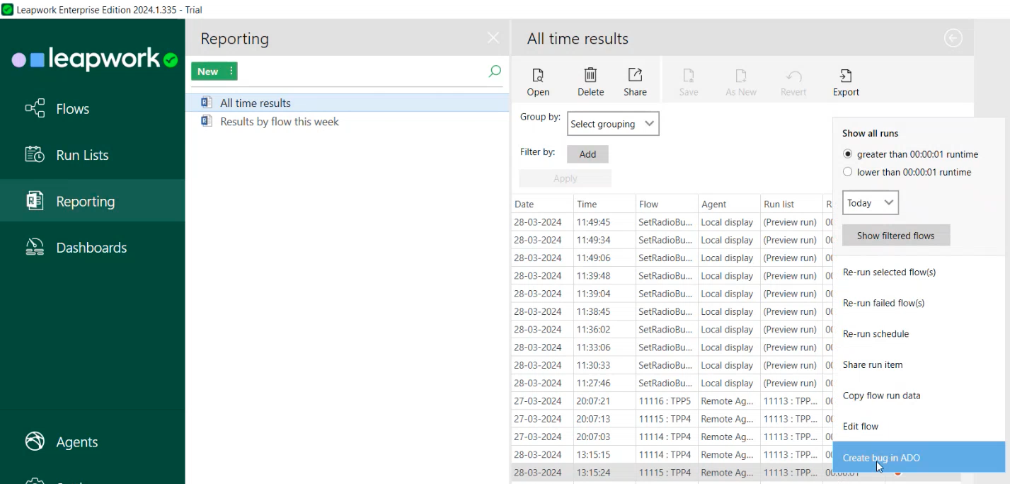 - In Leapwork, click Reporting.