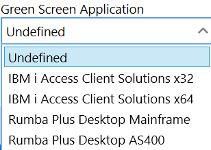 This property defines that the default value is Undefined. The five available options in this property are Undefined, IBM i Access Client Solutions x32, IBM i Access Client Solutions x64, Rumba Plus Desktop Mainframe and Ruma Plus Desktop AS400.