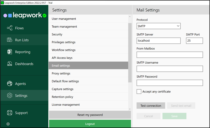 Check the Accept any certificate checkbox. This configuration instructs LEAPWORK to ignore any invalid SSL certificates in the communication with the SMTP server.