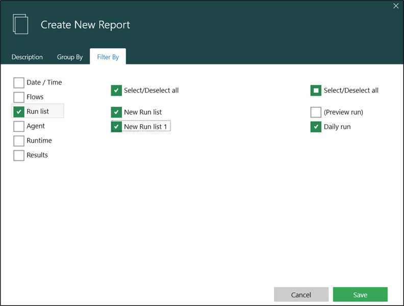 On the 'Filter By' tab, specify the conditions to filter the flow run results by. In the example below, the report will only show results from automation flows that was executed as part of the run list named as ‘New Run list’ and schedule named as 'TestSchedule'.